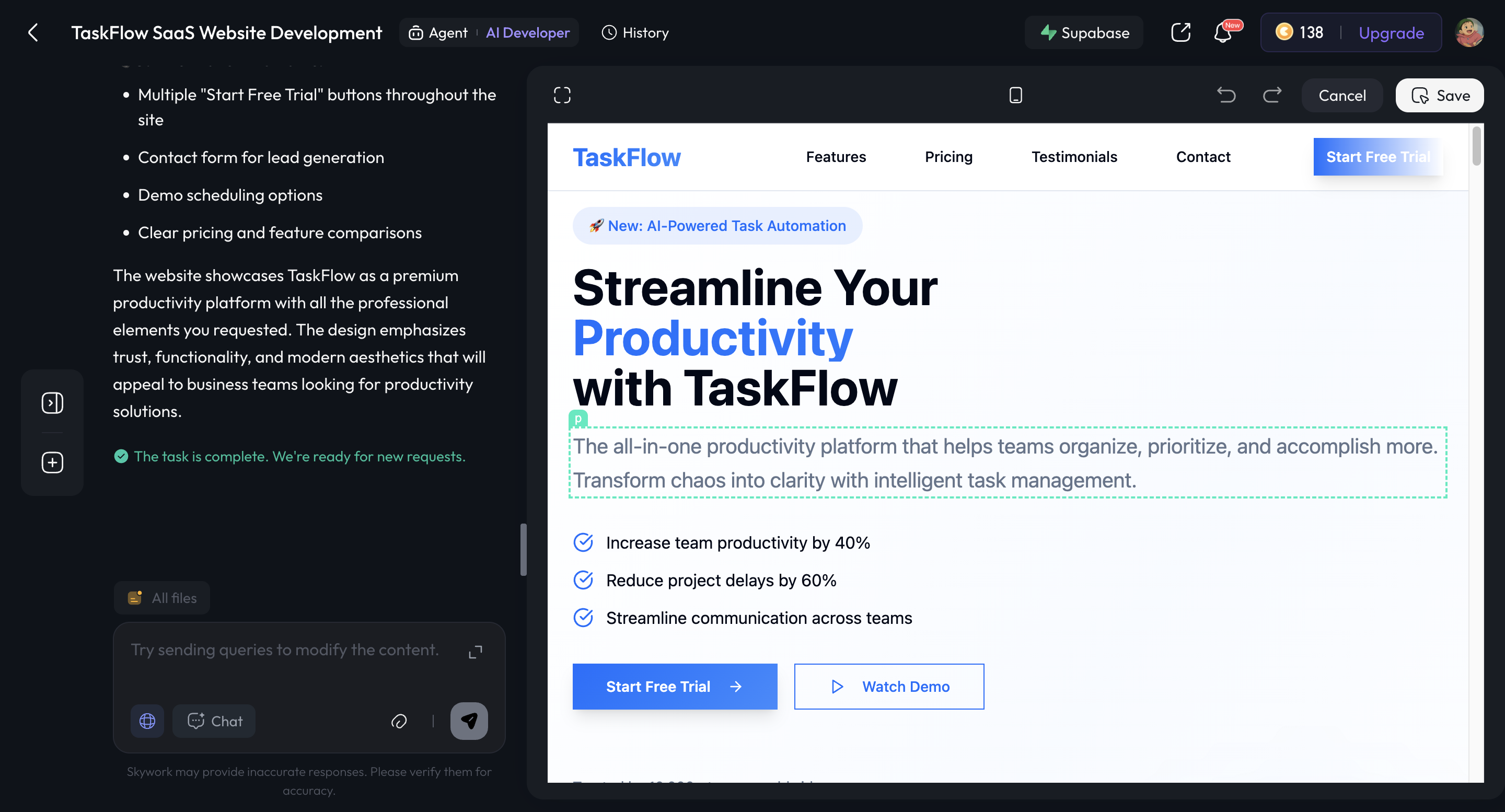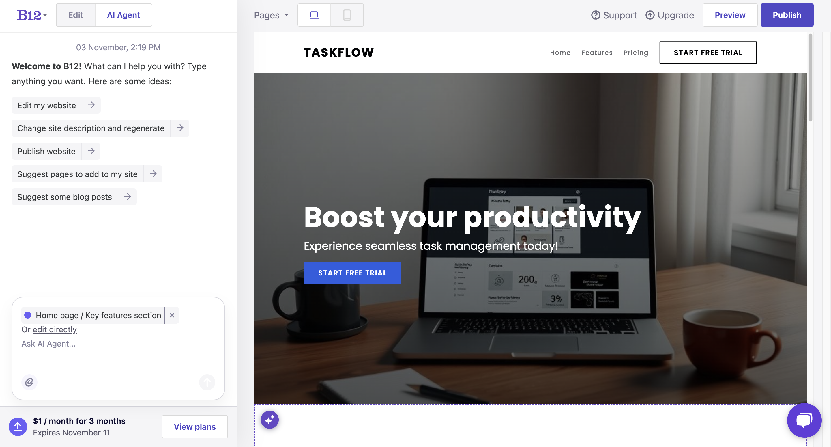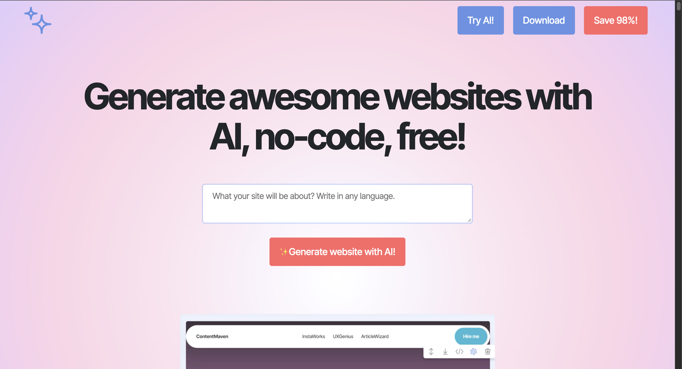 Auto-generates websites from short prompts describe your business, get a full page instantly.