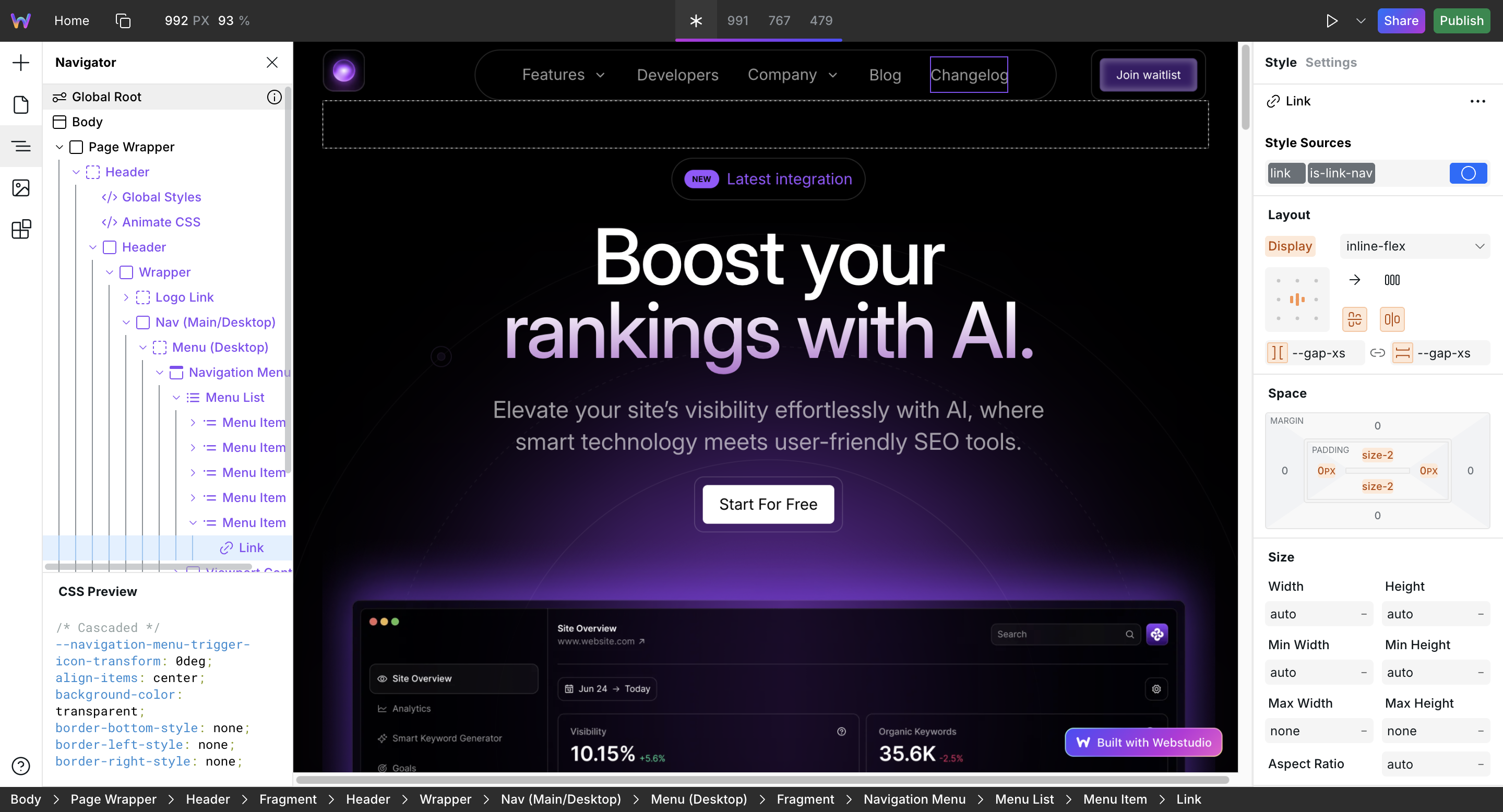 An open-source visual design platform like Webflow (without the paywalls), for pros who want total creative control.